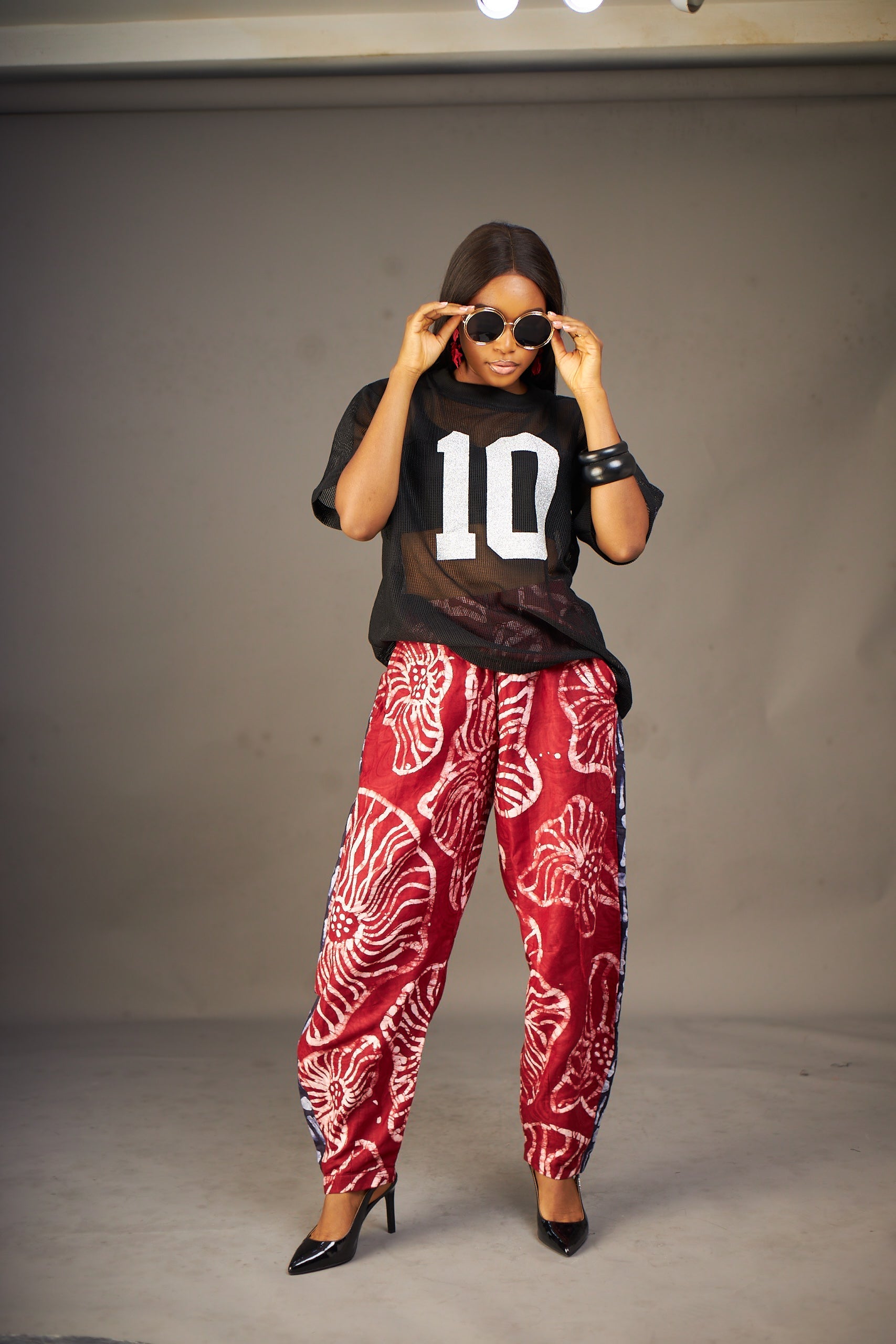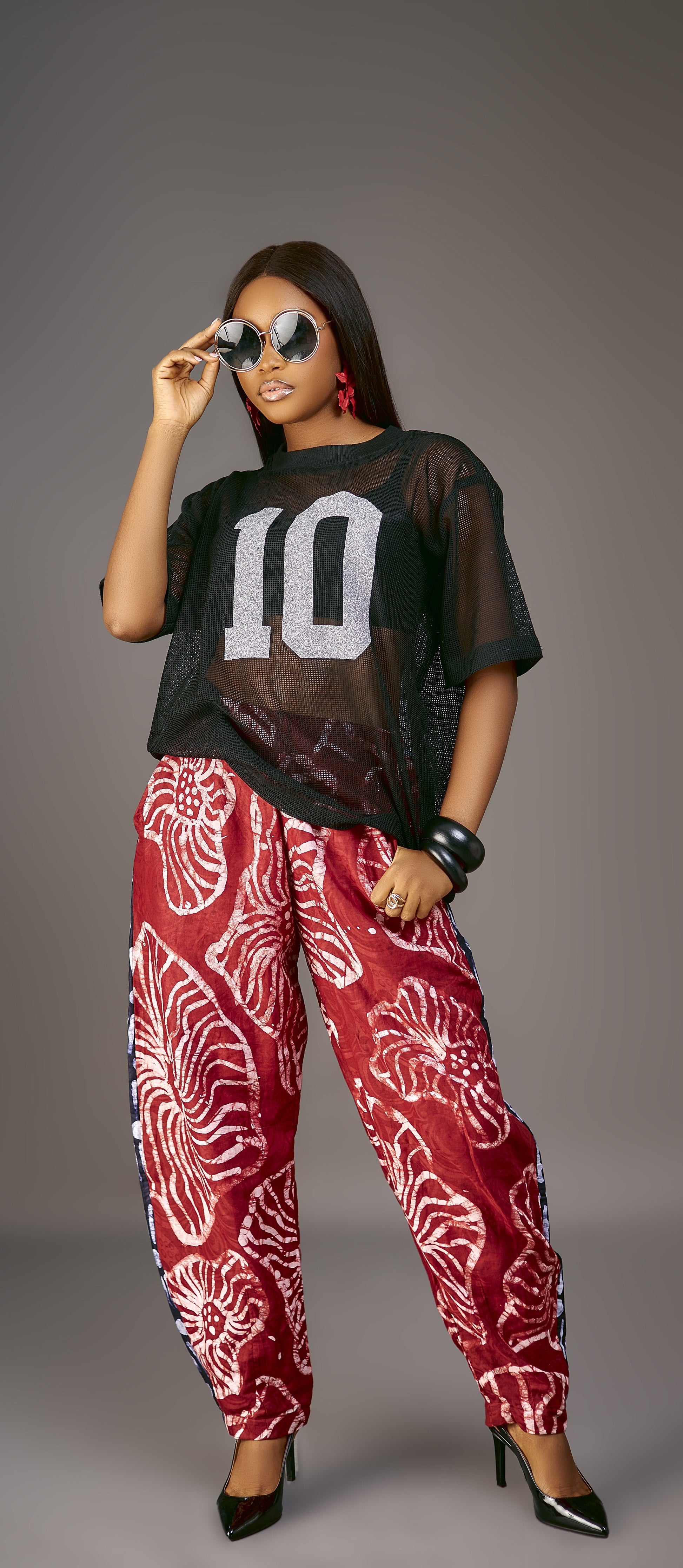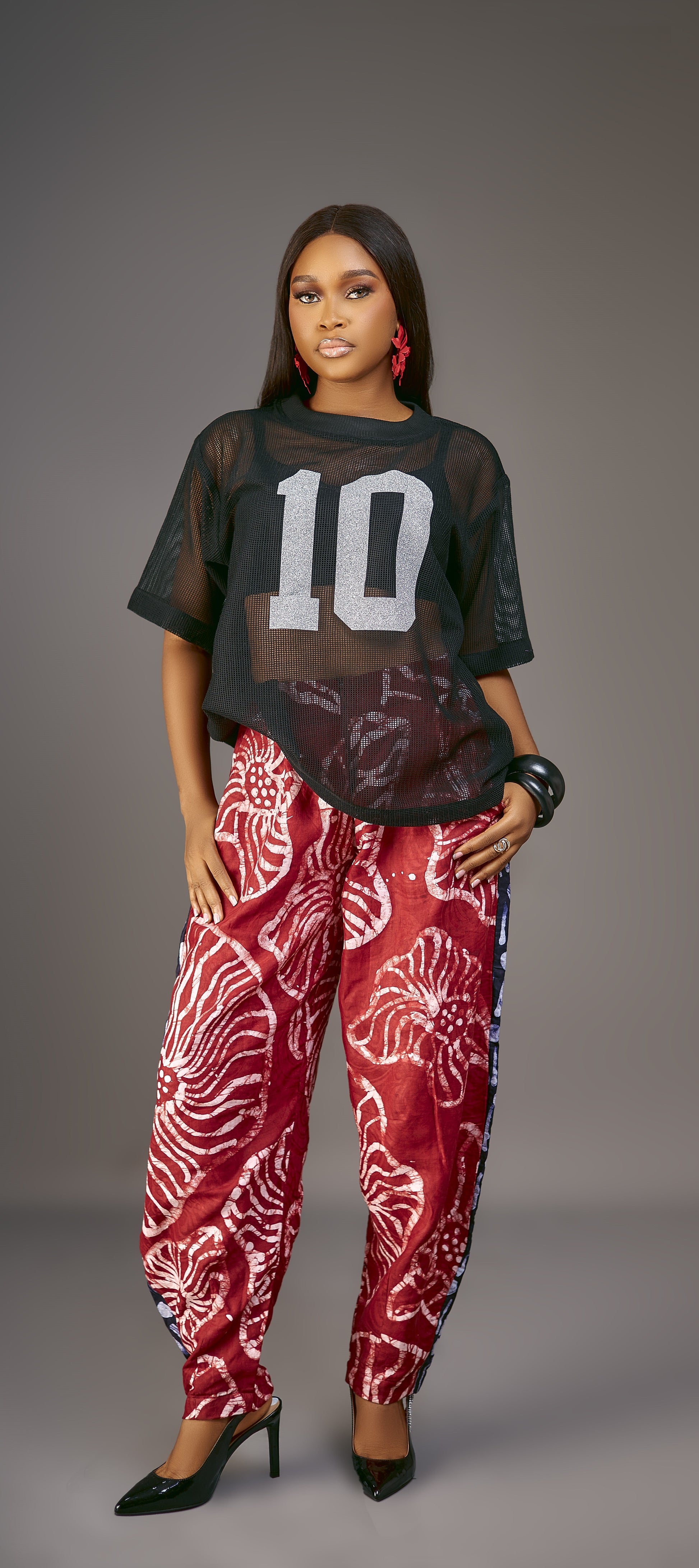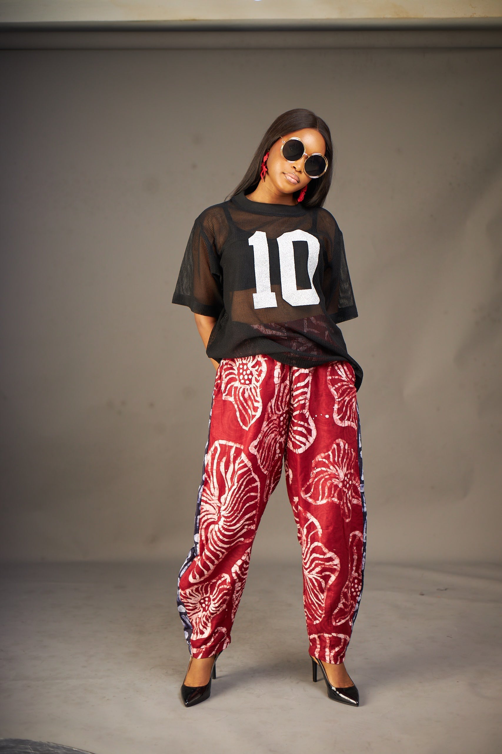 Own your sporty-chic vibe with the Esosa Mesh Top, styled here in true cool-girl fashion with our hand-dyed Adire barrel pants. The oversized jersey-inspired silhouette gives laid-back confidence, while the sheer black mesh keeps it playful and edgy.