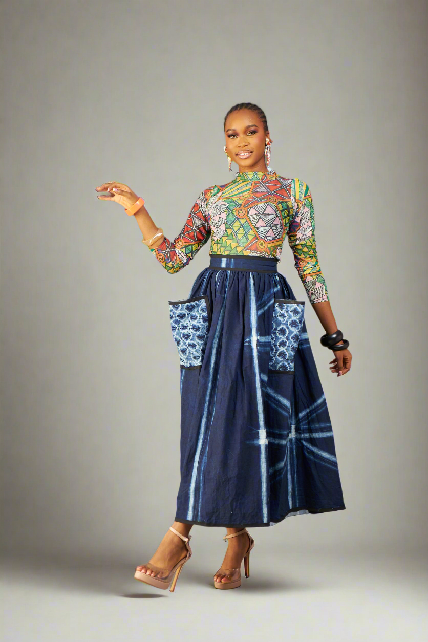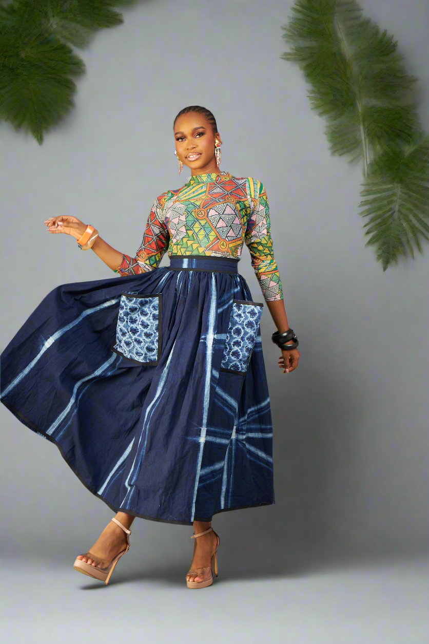 Add a vibrant twist to your everyday wardrobe with the statement Ngozi Skirt, crafted from richly hand-dyed Kano Adire. Whether you're styling it for work, Sunday brunch, or a cultural event, this skirt brings elegance with an edge. Pair it effortlessly with the Nina Mesh Top for a bold, print-on-print look that celebrates African creativity. Top and skirt Sold separately.